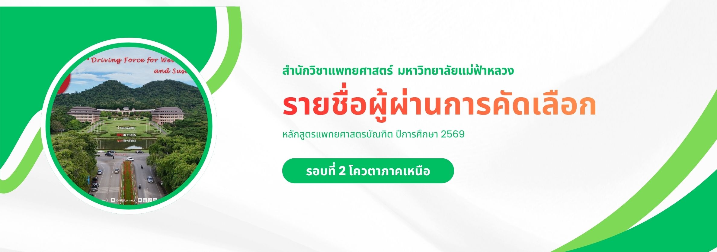 1. ประกาศรายชื่อผู้ผ่านการคัดเลือกเข้าศึกษาหลักสูตรแพทยศาสตรบัณฑิต ปีการศึกษา 2569 รอบที่ 2 โควตาภาคเหนือ พร้อมรายชื่อ ประเภทสำรอง